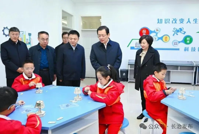 11月7日,市委书记丁小强深入潞州区调研“家校社协同育人”工作。这是丁小强在潞州区东街小学体育路校区科技活动室调研学生社团开展情况。