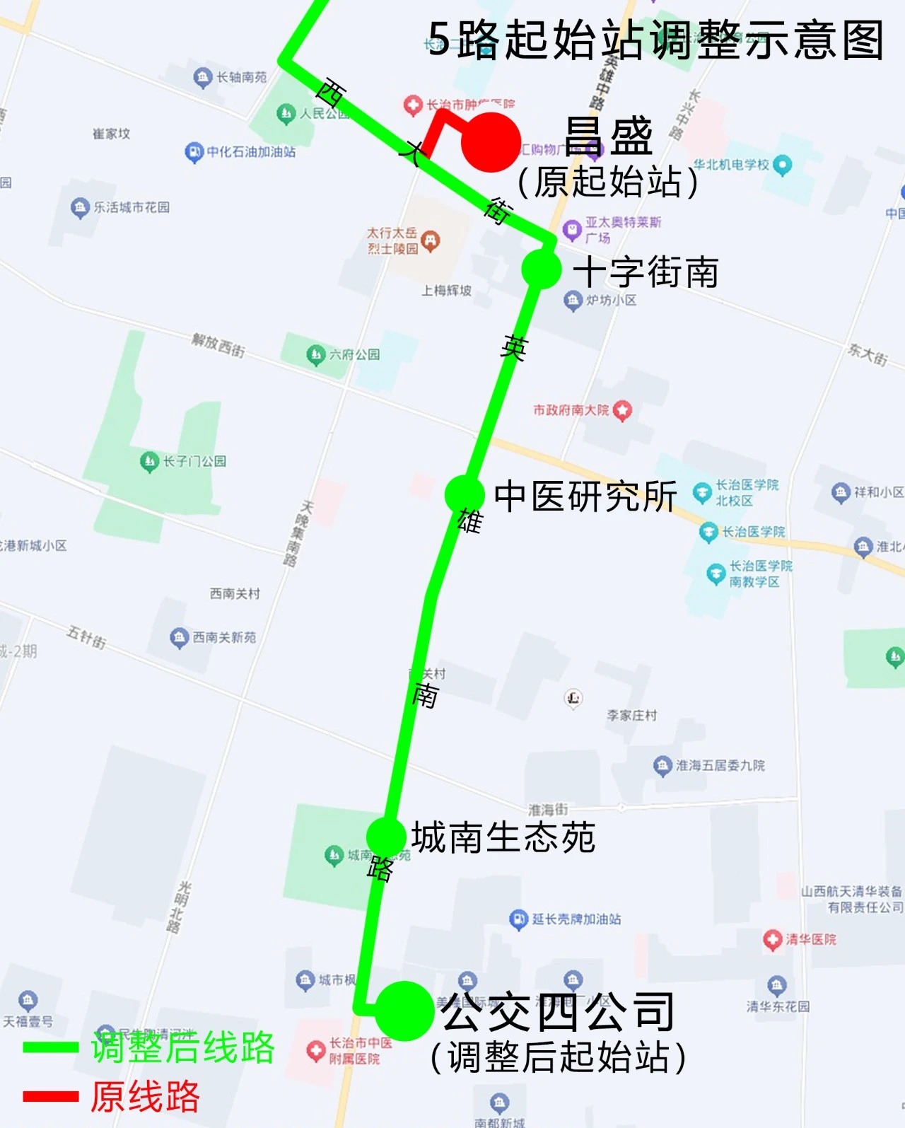 5路自公交四公司始发,沿英雄南路行至西大街口向西左转,沿西大街行至昌盛恢复原线路行驶。途经潞安剧院、中医研究所、城南生态苑等站点。