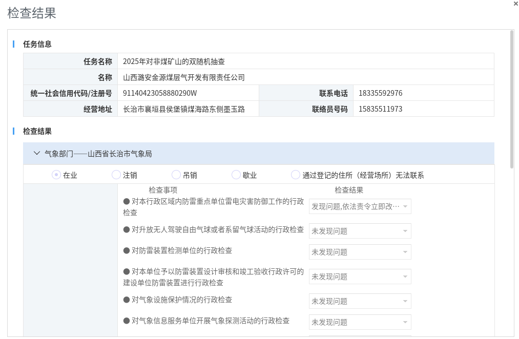 2025年长治市应急管理局“双随机、一公开”抽查检查结果公示(非煤矿山))