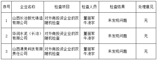 长治市商务局2025年度对外商投资企业双随机抽查结果公示