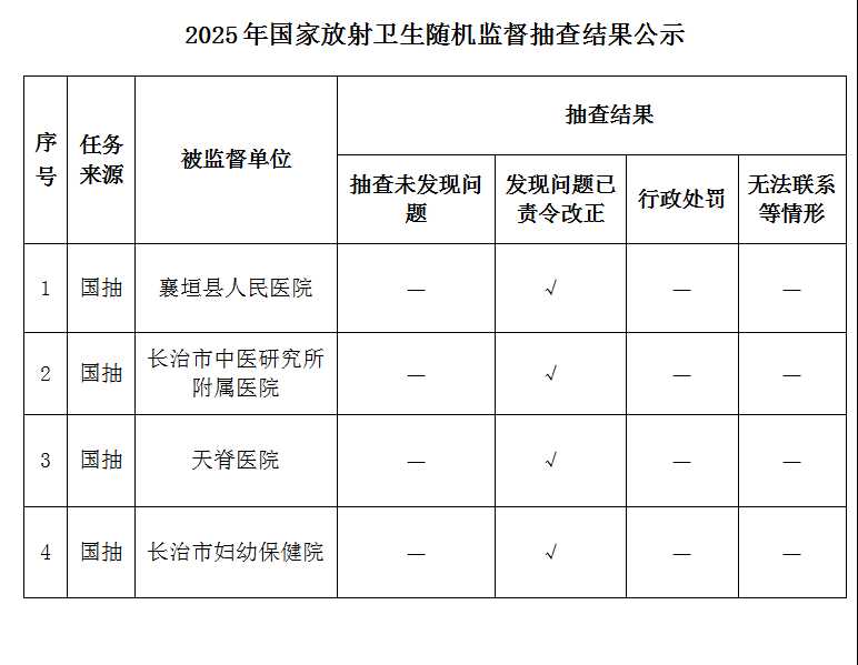 根据《长治市疾病预防控制局关于印发2025年全市疾病预防控制随机监督抽查计划的通知》(长疾控监督函〔2025〕1号)要求,长治市疾病预防控制中心(长治市卫生监督所)已完成2025年放射卫生随机监督抽查任务,现将监督及抽检结果公示如下: