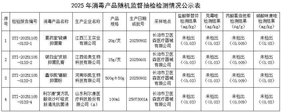 根据山西省疾病预防控制局综合处《关于印发2025年全省疾病预防控制随机监督抽查计划的通知》(晋疾控综监督函〔2025〕9号)及长治市疾病预防控制局工作要求,长治市疾病预防控制中心(长治市卫生监督所)已完成2025年国家消毒产品随机监督抽查任务,现将监督抽查结果公示如下