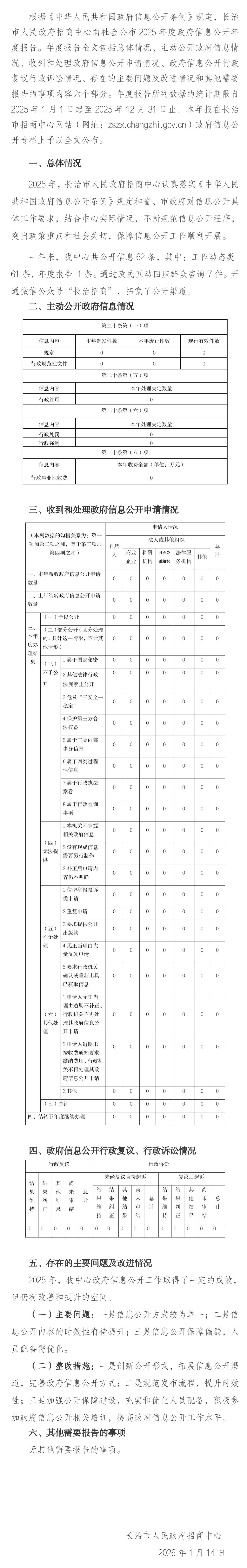 长治市人民政府招商中心2025年政府信息公开工作年度报告