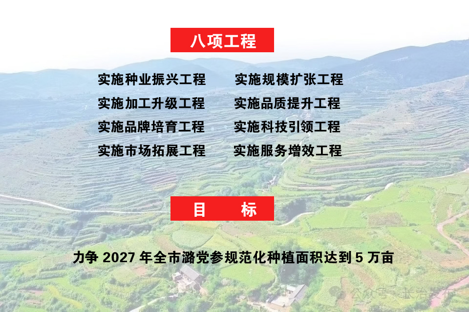 规模扩张工程。重点打造太行山、太岳山两大潞党参种植区,大力发展生态种植、林下(林缘)和坡地种植,充分利用撂荒土地,有序扩大潞党参种植规模。推广“幸福农法”、小蚯蚓微生物农法等生物种植和种子丸粒化飞播技术,加强套种、轮作规划,提升生产效能。大力推进规范化种植,力争2027年全市规范化种植面积达到5万亩。