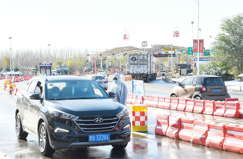 11月7日,长治西高速路口,市公安、卫生、交通等部 门工作人员对进入市区的车辆及人员 进行防疫检查,落实防控措施,筑牢防疫屏障。 (记者 李宁 张国平 摄)
