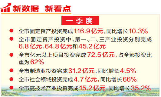 记者王涵通讯员张贤报道:今年以来,我市深入贯彻落实全市项目建设年推进大会精神,扎实开展“三个一批”活动,狠抓项目建设不松劲,全力以赴推动项目签约落地、开工建设、投产达效,为我市不断深化全方位转型、加快推动高质量发展蓄势赋能。一季度,全市固定资产投资完成116.9亿元,同比增长10.3%,比全国增速高5.8个百分点,比全省增速高4.1个百分点。