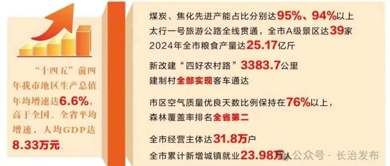 经济实力稳步提升。坚持统筹稳增长、扩内需、促转型,“十四五”前四年长治市地区生产总值年均增速达6.6%,高于全国、全省平均增速,人均GDP达8.33万元。新质生产力加快培育。加快国家创新型城市建设,省级以上科技创新平台达97家。煤炭、焦化先进产能占比分别达95%、94%以上,新兴产业初步形成了光伏、光电LED、现代医药、电子信息等14条市级产业链。太行一号旅游公路全线贯通,全市A级景区达39家,“壮美太行 久安长治”文旅品牌进一步擦亮。三农根基持续巩固。2024年全市粮食产量达25.17亿斤。潞党参口服液进入国家医保目录,长治党参栽培系统入选全球重要农业文化遗产预备名单;沁州黄小米入选全国名特优新农产品名录,成为农业农村部乡村振兴与农业品牌化标杆案例。全省特优农业高质量发展现场推进会、全省学习运用“千万工程”经验推进乡村全面振兴现场会、全省全域土地综合整治现场会在我市召开。城乡面貌持续改善。加快推进上党城镇群建设,全市常住人口城镇化率由“十三五”末的56.47%提升到60.65%。黎霍高速(黎城至沁源段)通车,实现县县通高速公路。滨湖生态新区加快建设,市博物馆、图书馆、档案馆成为长治新地标。新改建“四好农村路”3383.7公里,建制村全部实现客车通达。改革开放纵深推进。组建国运、太行建投、太行文旅、水投、农林发展公司等国资企业,推动国资布局优化。深入推进“高效办成一件事”改革,全市经营主体达31.8万户。外资外贸稳中提质,进出口总额年均增长14%。绿色发展步伐加快。坚决打好蓝天碧水净土保卫战,市区空气质量优良天数比例保持在76%以上,国控断面水质全部优良,森林覆盖率排名全省第二。大力发展新能源和清洁能源,2024年全市单位GDP能耗较“十三五”末下降14.6%。民生福祉持续增进。全市累计新增城镇就业23.98万人,城乡居民收入差距进一步缩小。“双减”试点顺利通过国家验收,建成省级区域医疗中心。连续5年被评为全省平安建设先进市,平安长治建设成效显著。