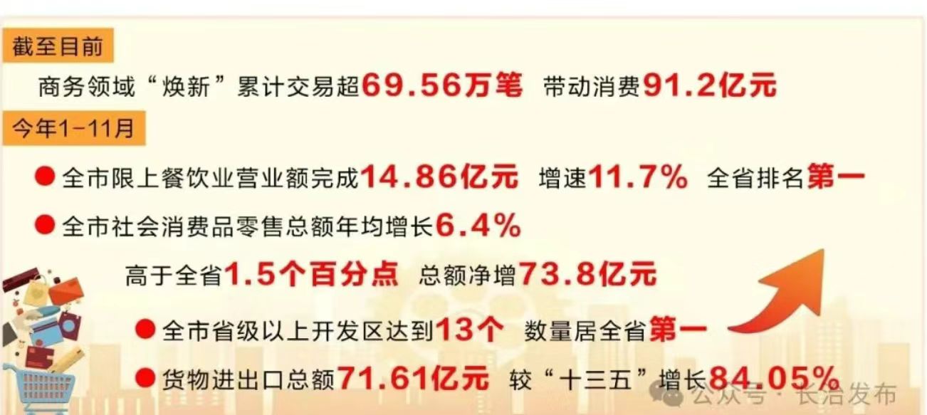 消费市场稳中向好。“十四五”期间,我市积极落实各项促消费政策,推动消费规模稳步扩大、结构不断升级。在消费品“以旧换新”活动中,在政策扩围上做加法,在流程优化上做减法,让优惠政策更广泛、更快捷惠及广大消费者。截至目前,商务领域“焕新”累计交易超69.56万笔,带动消费91.2亿元。打造了一批核心夜间经济集聚、地标性商业集聚区、大型夜间美食示范街区。推出“八盘八碟八碗”及八大面食评选活动,打造长治美食名片。今年1-11月,全市限上餐饮业营业额完成14.86亿元,增速11.7%,全省排名第一。创建沁州黄等一批省级电商示范企业和示范基地,举办一系列网络促消费活动。“十四五”全市社会消费品零售总额年均增长6.4%,高于全省1.5个百分点,总额净增73.8亿元。全市批零住餐业法人企业由“十三五”末的1.3万家增加到目前的近4万家,限额以上经营单位由704家增加到1332家,年均新增160家。