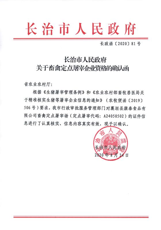 长治市人民政府关于畜禽定点屠宰企业资格的确认函