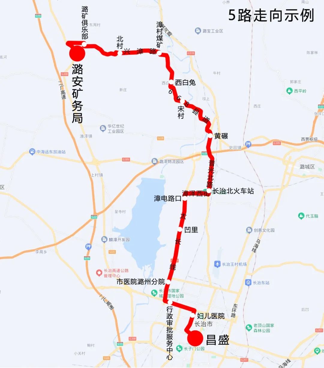 线路走向:5路自昌盛按原线路始发,行驶至迎宾大道西二环路路口向北右转,沿西二环路行至漳泽西街口向东右转,沿漳泽西街、102省道、668县道、兴漳路到达终点站潞矿西区。