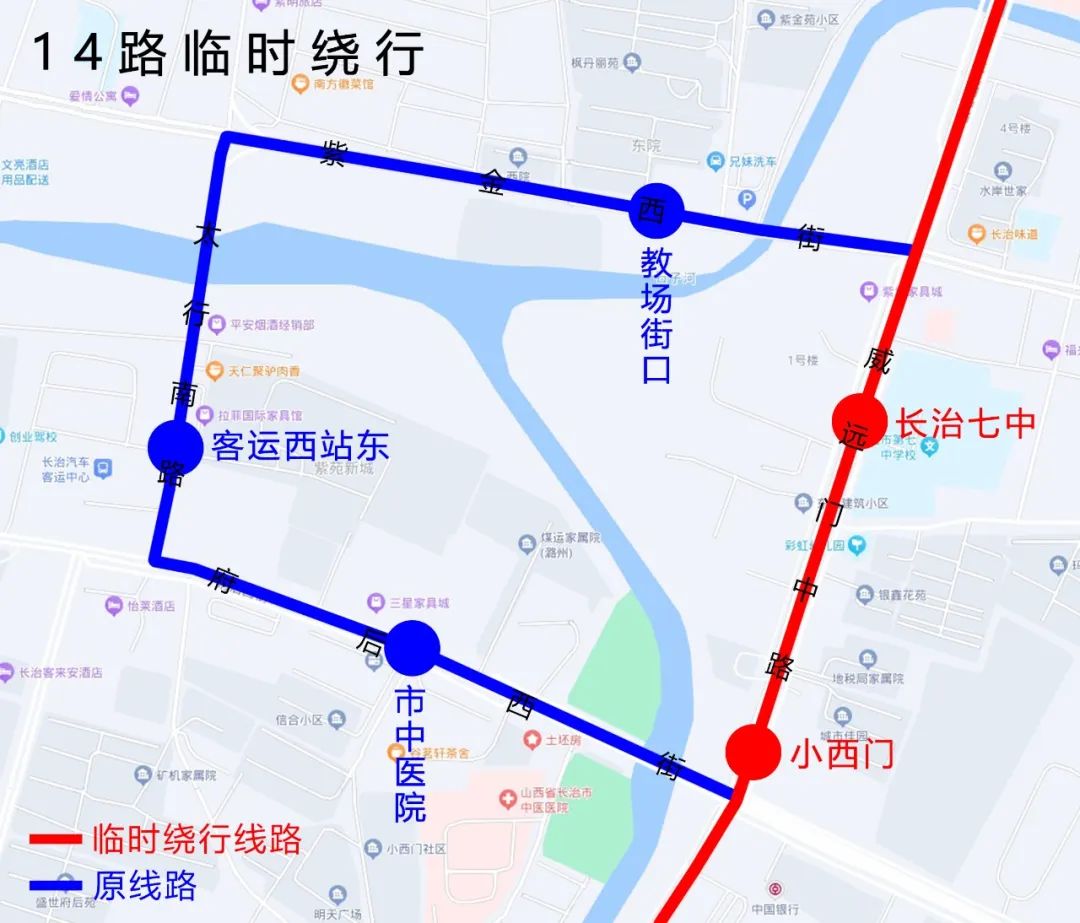 因紫金西街(太行南路---西环路)实行临时交通管制,长治公交集团定于2023年3月8日——3月12日对14路、19路、20路、28路公交线进行临时调整,具体调整如下: