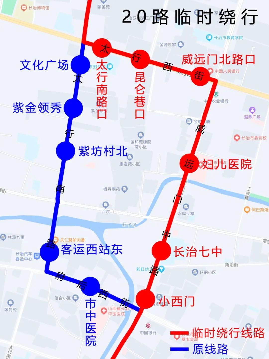 20路自始发站潞州政务始发,行驶至威远门路府后西街口继续向北直行,沿威远门中路(途经小西门、长治七中、妇儿医院)行至太行西街口向西左转,沿太行西街(途经威远门北路口、昆仑巷口、太行南路口)行至太行北路口向北右转恢复原线路。