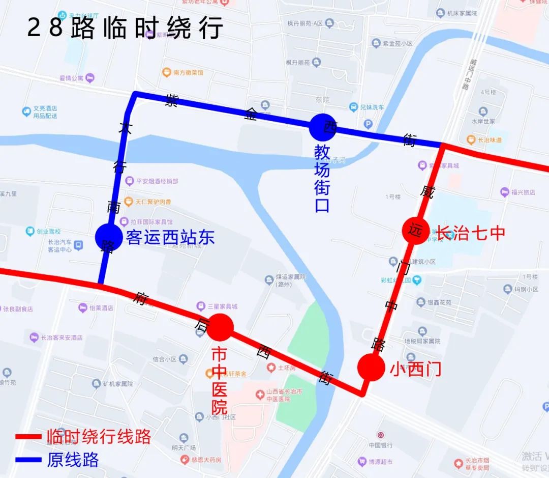 28路自始发站高铁东站始发,行驶至紫金东街威远门中路口向南左转,沿威远门中路(途经长治七中)行至府后西街口向相右转,沿府后西街(途经市中医院)行至太行南路口恢复原线路。
