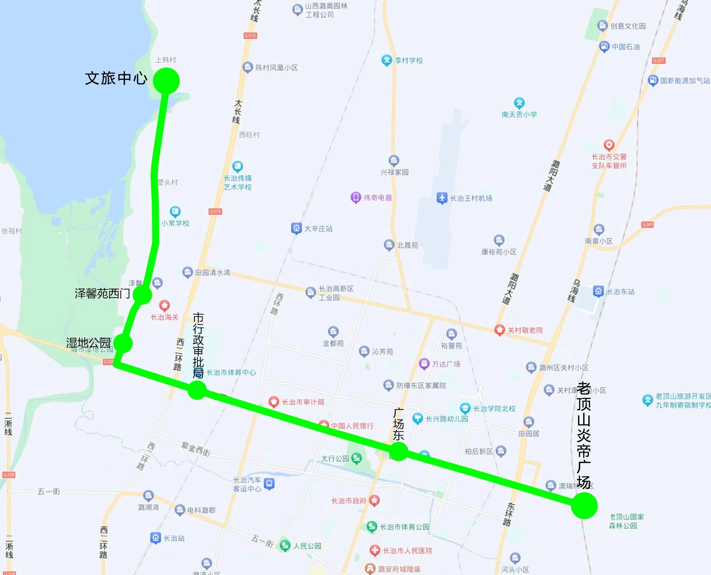 始发站炎帝广场,和济医院、交警一大队、广场东、广场西、太行公园(金威超市)、西环路口(博物馆)、体育路口(屈家庄)、行政审批服务中心、滨湖路口(北寨)、湿地公园,终点站文旅中心。