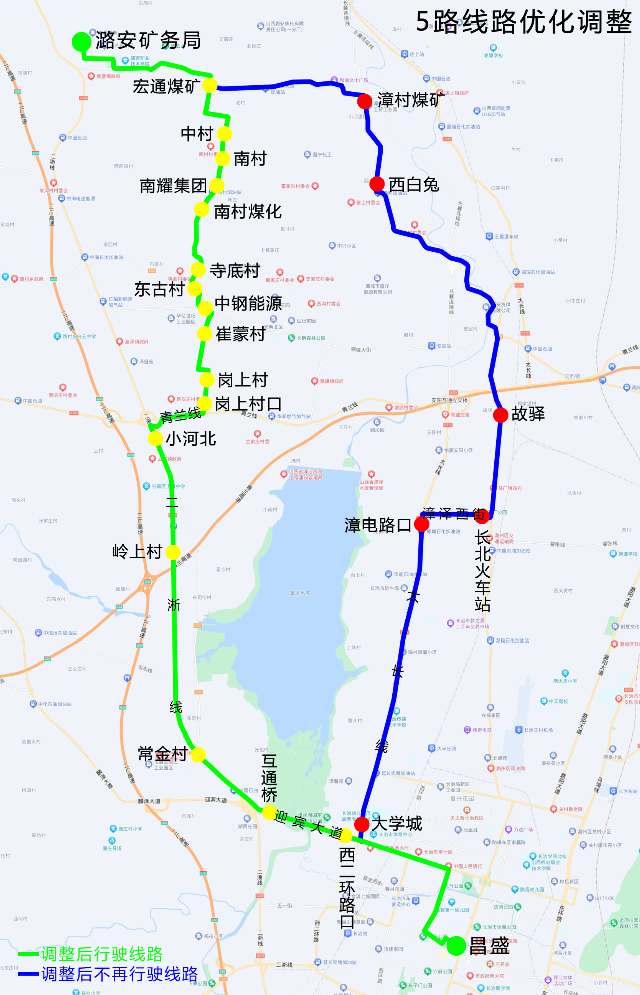 5路公交线自昌盛始发,沿二淅线(原208国道)行至小河北向东右转,沿青兰线行至岗上村口向北左转,途径岗上村、崔蒙村、东古村、寺底村、南耀集团、南村、中村,终点站潞安矿务局,返程同上。