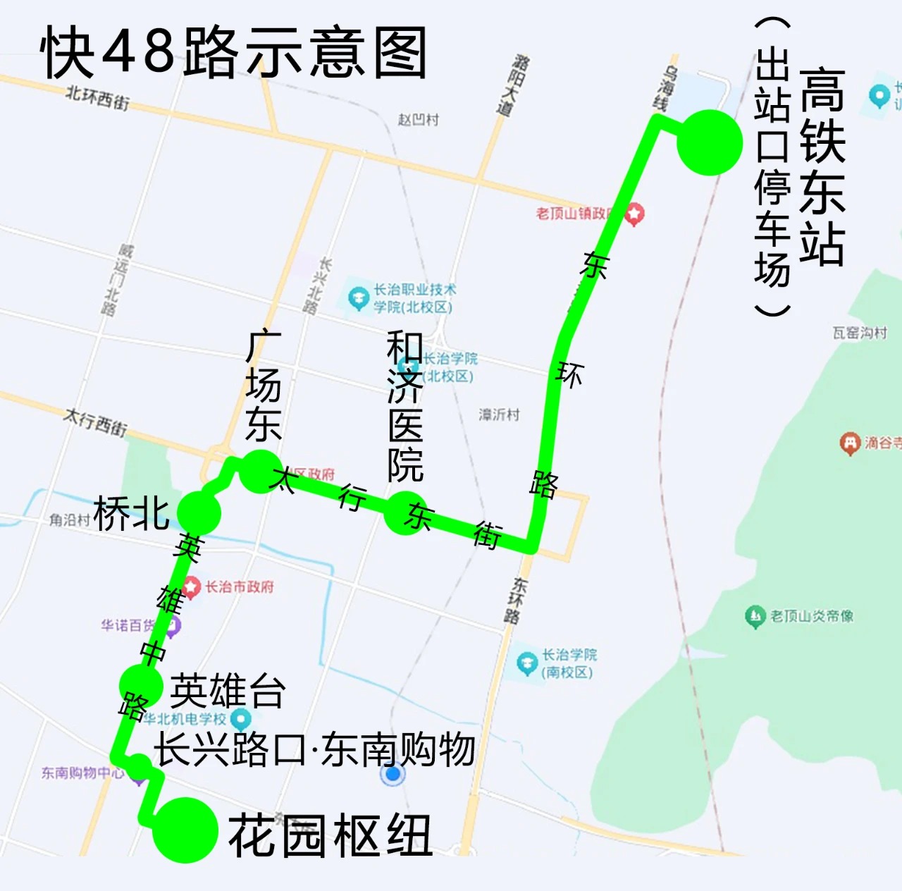 花园枢纽始发,途经长兴南路、东大街、英雄中路、太行东街、东环路、安泽街,终点站高铁东站(出站口停车场)。