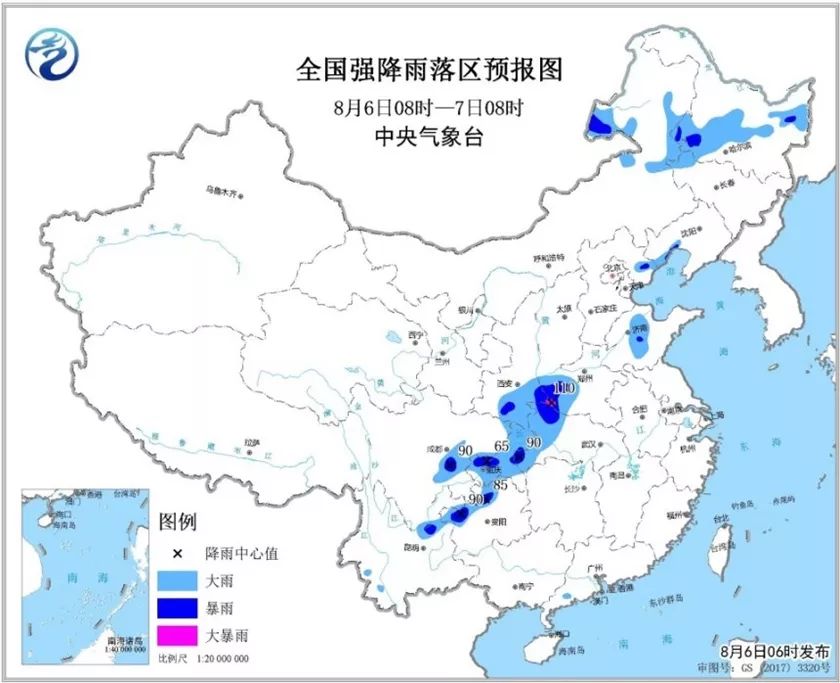 预计,8月6日08时至7日08时,内蒙古东部、黑龙江中南部、辽宁西南部、河北东北部、山东中部、河南西部、陕西南部、湖北西部、四川东部、重庆大部、贵州北部、云南东北部等地的部分地区有大到暴雨,局地大暴雨(100~110毫米)。上述部分地区伴有短时强降水(最大小时降雨量20~50毫米,局地可达60毫米以上),局地有雷暴大风等强对流天气。