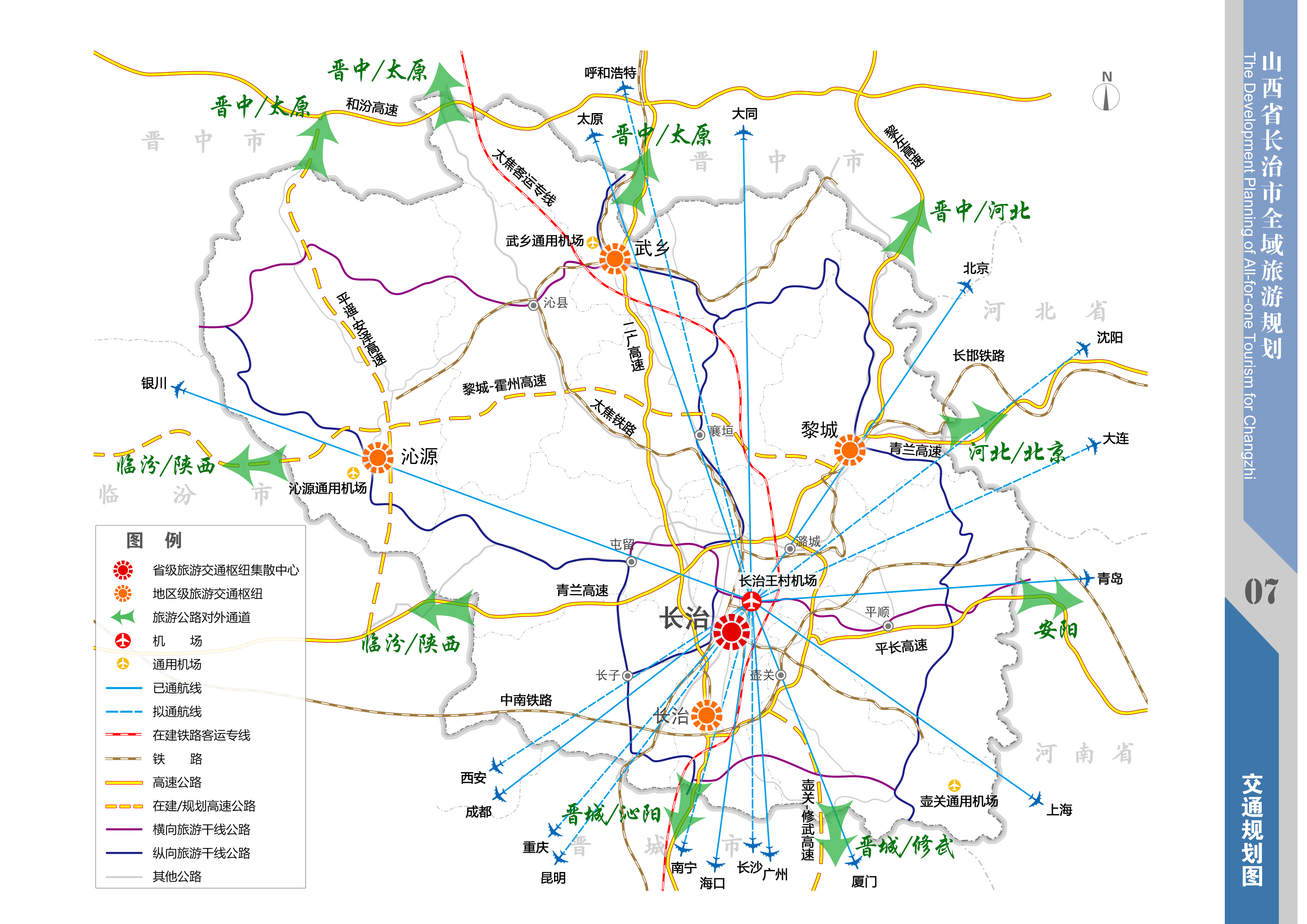 (1)“天脊列车”高铁旅游发展轴:以太焦高铁(在建)为交通依托,以沿线红色文化、城乡风貌、古建大观等为吸引,重点做好武乡红色旅游、襄垣文化旅游、长治城市休闲、上党古建文化游等四大节点特色旅游产品,贯穿长治市南北区域,形成南北发展轴,辐射带动沿线区域旅游发展。结合高铁沿线设置的武乡西站、襄垣东站、长治东站、上党区站(原长治县站)四个站点,完善旅游集散功能,将跨区域的高铁游客迅速疏散到长治全域。开发“天脊高铁”特色游线,丰富高铁旅游产品。