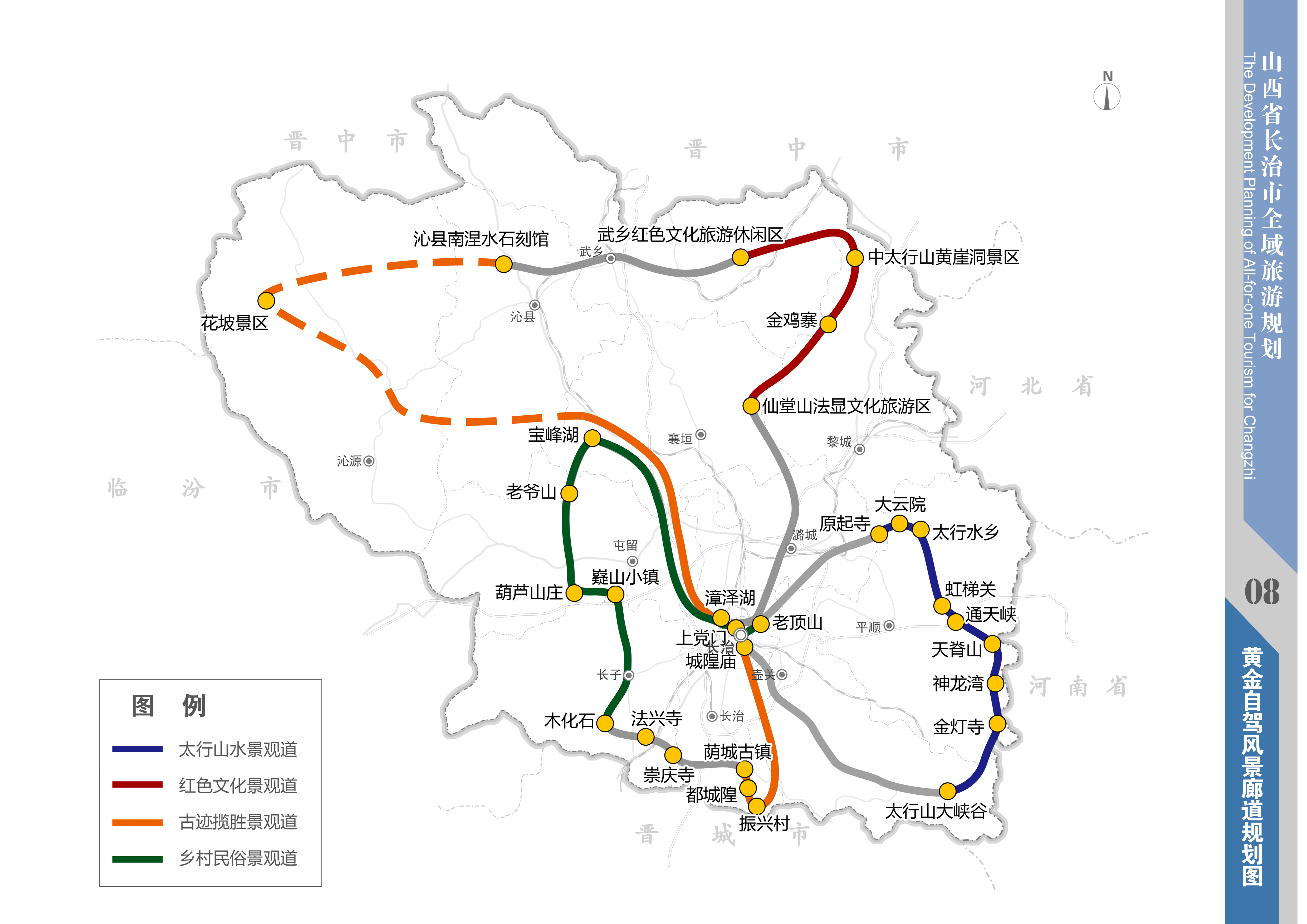 交通优化,全域畅通。抓住太行一号国家旅游专用干线公路建设机遇,着力推进长治太行峰路建设,增强旅游路网要素功能,加强道路的交通作用和旅游功能结合,在满足道路的基本交通需求外,更加具备旅游功能。通过打造四条黄金风景廊道、两大自驾体系、八大集散服务中心,建设深度自驾游目的地。