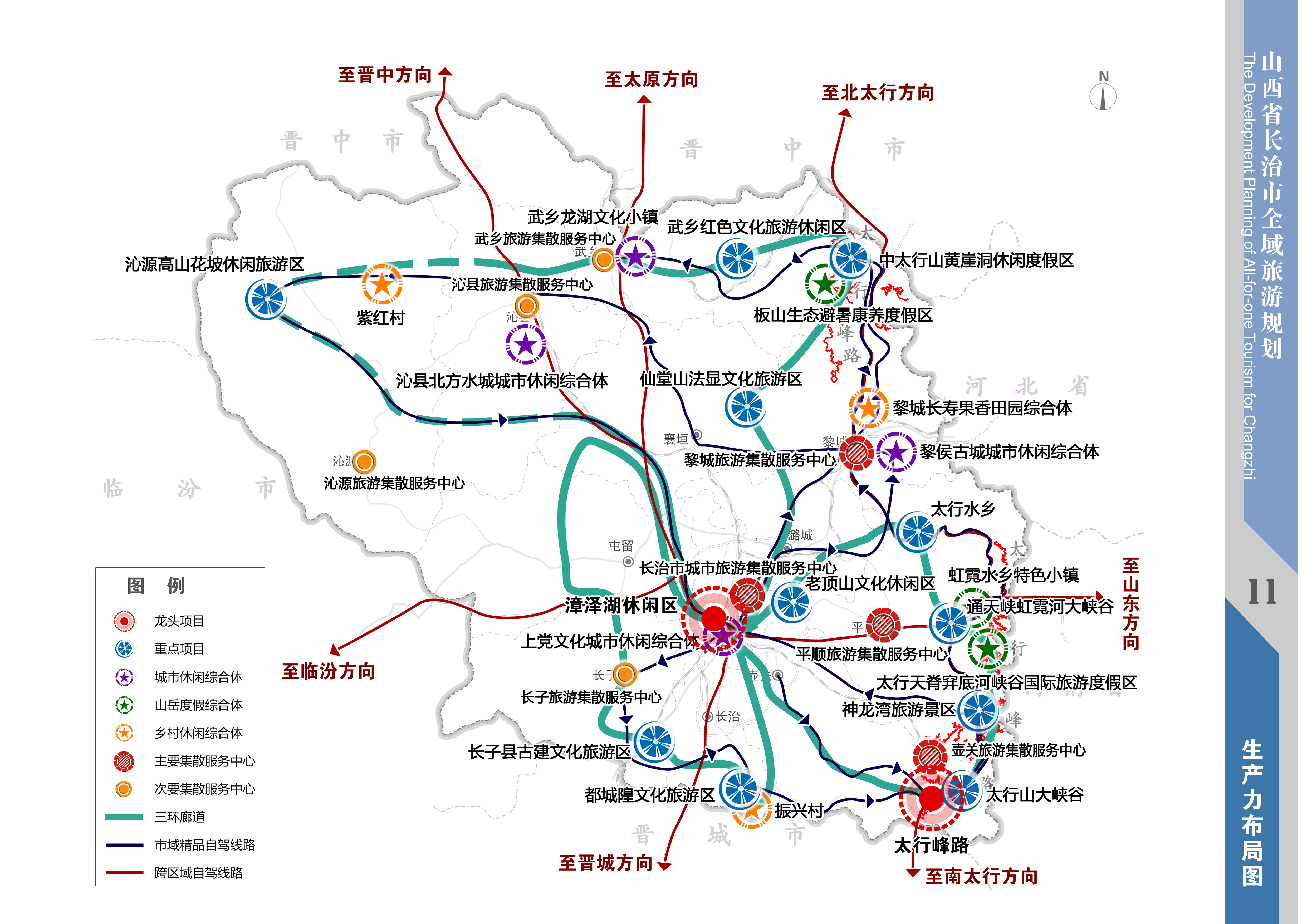全面打造“一核崛起、一路盘活、两轴带动、四区推进”的全新生产力布局。“一核”为长治市城市休闲服务核,“一路”为太行峰路,“两轴”为“天脊列车”高铁旅游发展轴和长治生态旅游绿色发展轴,“四区”分别为太行山水旅游区、上党文化休闲区、红色文化体验区、太岳休闲度假区。
