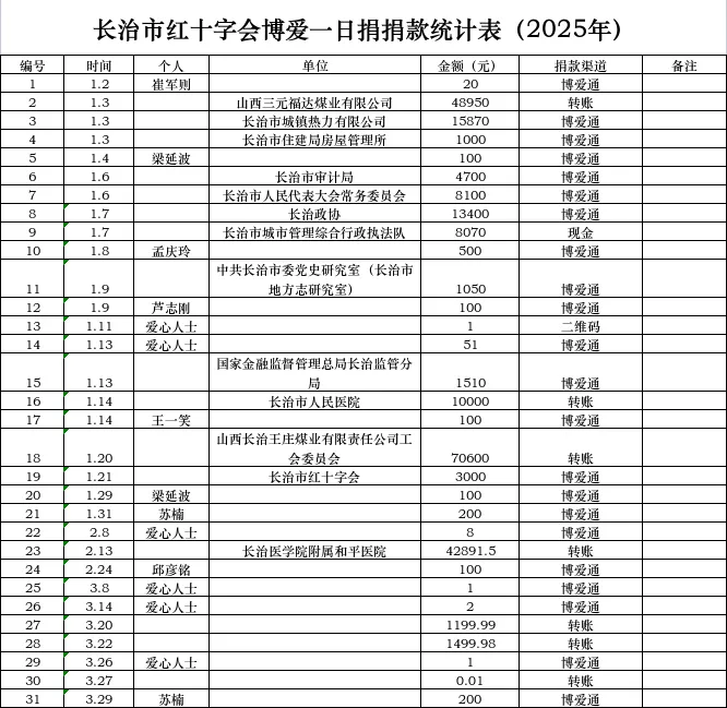 为做好信息公开,打造公开透明的红十字会,根据《中华人民共和国慈善法》《中华人民共和国红十字会法》《中国红十字会章程》的相关规定,现将长治市红十字会2025年1月1日—2025年3月31日累计捐款接收情况公示如下: