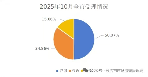 2025年10月份,全市市场监管12315机构共受理消费者投诉举报咨询698件,同比下降75.09%,环比下降75.80%。其中,投诉486件,占总量的73.75%,同比下降32.57%,环比下降31.60%;举报210件,占总量的25.99%,同比增加9.03%,环比下降22.76%;咨询2件,占总量的0.26%,同比下降99.90%,环比下降99.90%。投诉案件中,为消费者挽回经济损失2.6万元。详见下图: