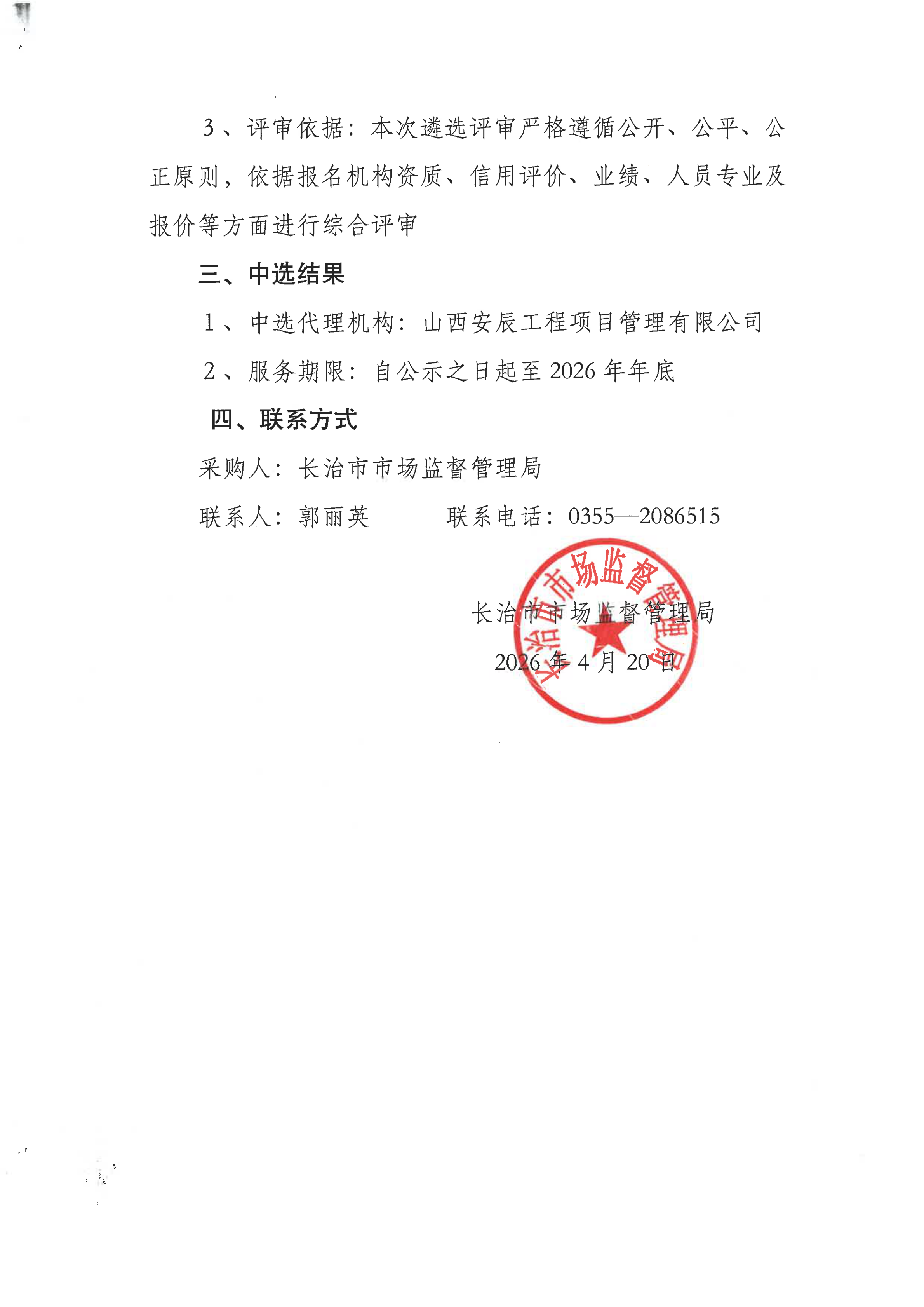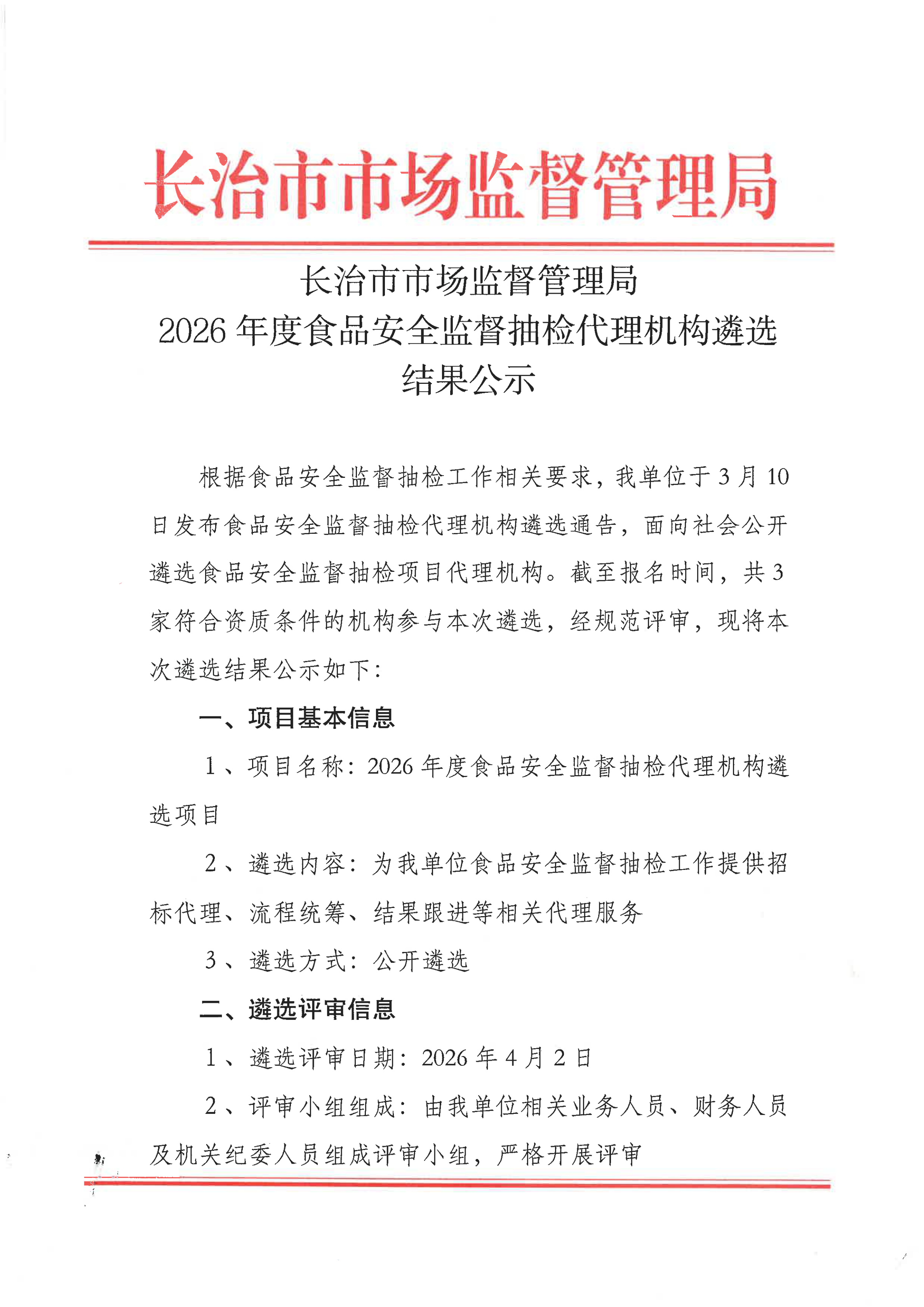 长治市市场监督管理局 2026年度食品安全监督抽检代理机构遴选结果通告