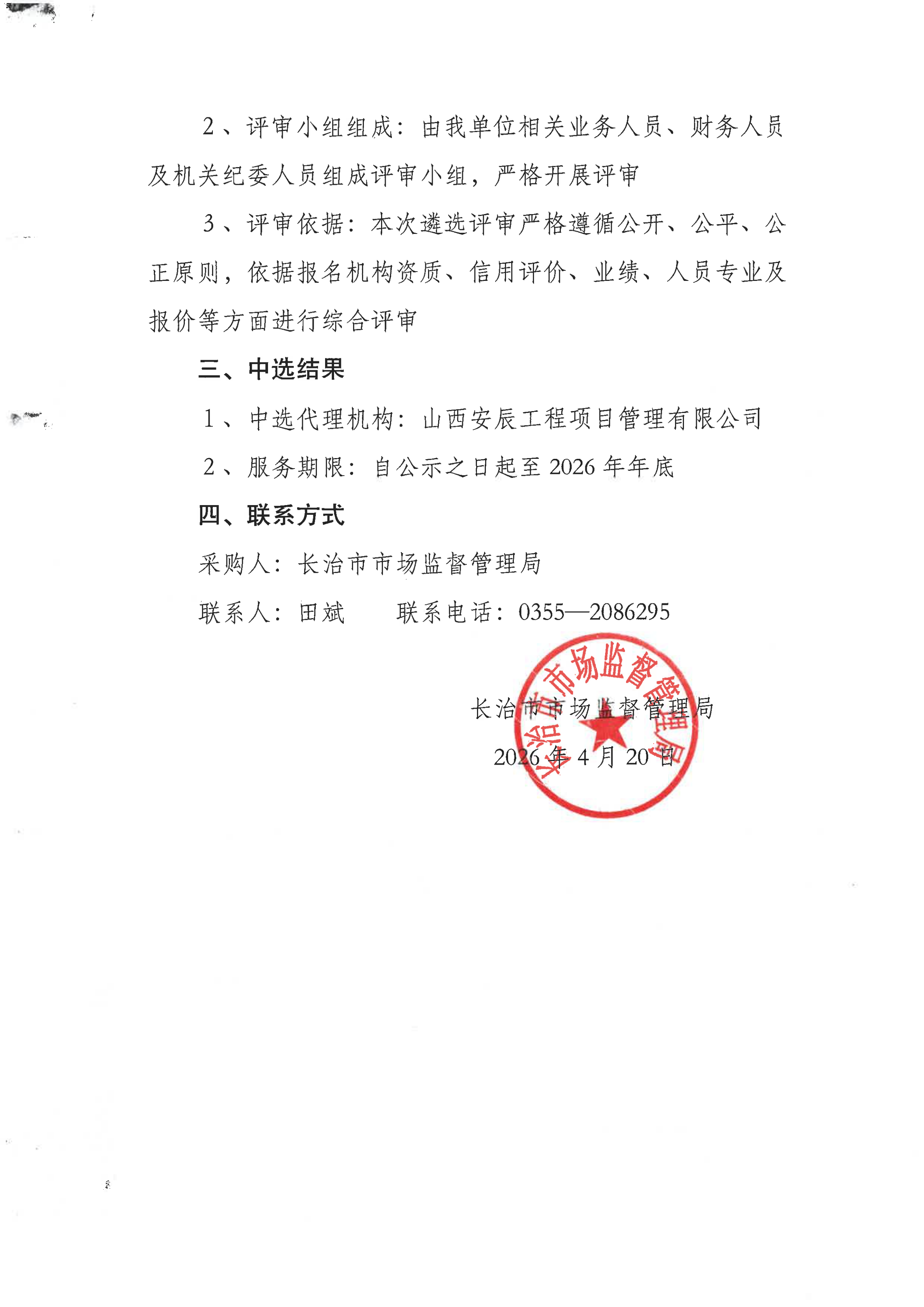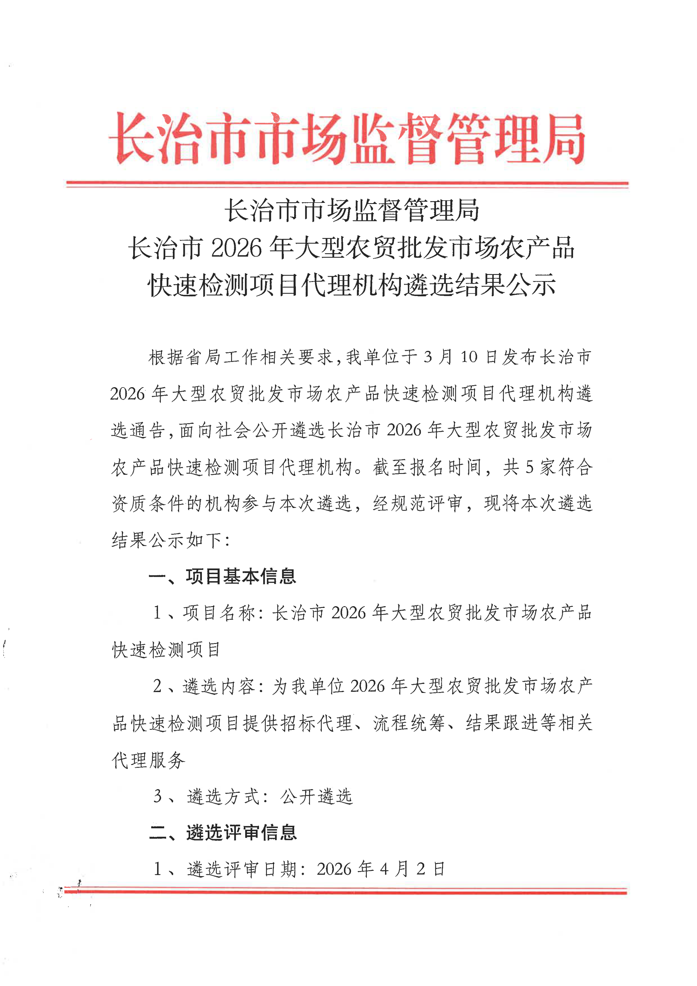 长治市市场监督管理局长治市2026大型农贸批发市场农产品快速检测项目代理机构遴选结果公示