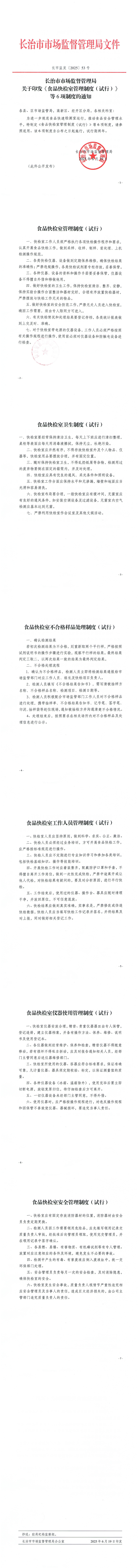 长治市市场监督管理局关于印发《食品快检室管理制度(试行》等6项制度的通知