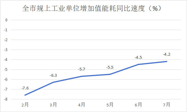 1-7月份全市规上工业单位增加值能耗同比下降4.2%,从累计逐月趋势看,全市规上工业单位增加值能耗同比速度呈现逐步收紧态势,节能降耗压力逐步加大,如下表所示。