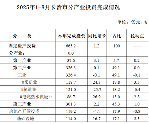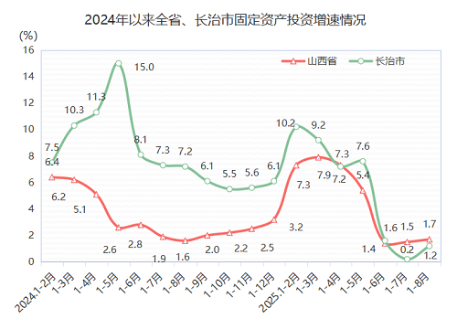 1-8月,长治市固定资产投资完成665.2亿元,总量居全省第二位,同比增长1.2 %,较上月回升1.0个百分点,增速居全省第八位,较全国(0.5%)高0.7个百分点,较全省(1.7%)低0.5个百分点。