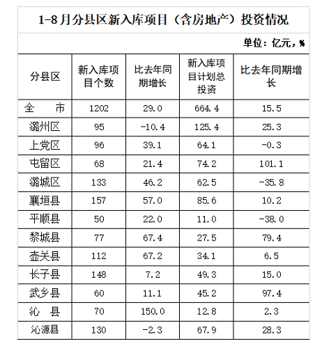 新入库投资项目平均规模偏小。1-8月全市新入库项目1202个,同比增长29.0%;计划总投资664.4亿元,同比增长15.5%。但新入库项目投资平均规模仅为5527万元,较上年同期(6170万元)减少643万元,同比下降10.4%。