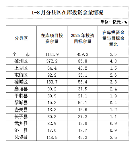 在库投资余量不足。1-8月,全市在库项目投资余量为1141.9亿元,比上年同期(1462.1亿元)减少320.2亿元,2025年投资目标总量为1124.5亿元,目标剩余总量为459.3亿元,在库剩余量与目标剩余量比为2.5倍,按照项目投资规律,建设期一般为2-3年,如需完成目标余量,在库剩余量应为目标剩余量的3倍左右,缺口为230亿元左右。分县区看,投资余量严重紧张的县区为黎城县、沁县,在库投资余量与目标余量比重仅为0.4倍和0.9倍。