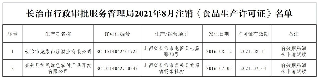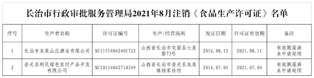 根据《中华人民共和国行政许可法》、《食品生产许可管理办法》第四十一条等有关规定,我局依法注销长治市龙泉山庄酒业有限公司等2家企业的《食品生产许可证》,现将注销情况(见附件名单)予以公告。