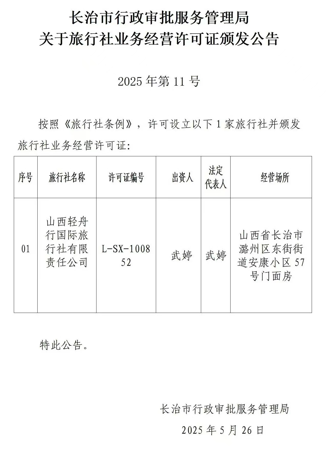 关于旅行社业务经营许可证颁发公告