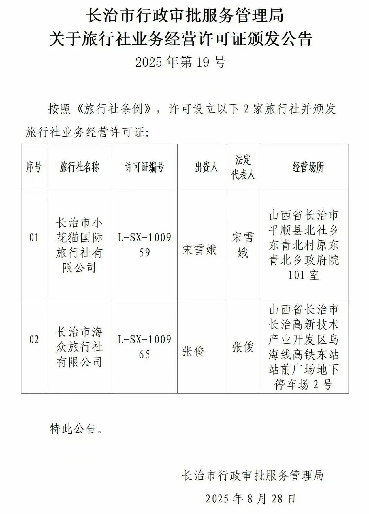 长治市行政审批服务管理局关于旅行社业务经营许可证颁发公告