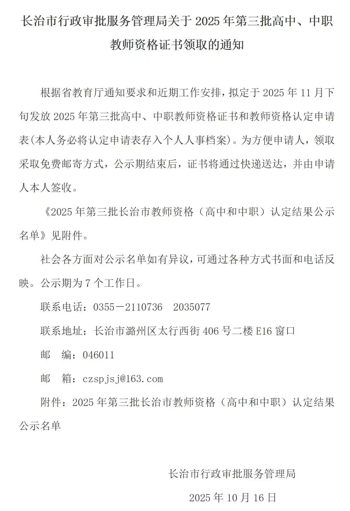 长治市行政审批服务管理局关于2025年第三批高中、中职教师资格证书领取的通知
