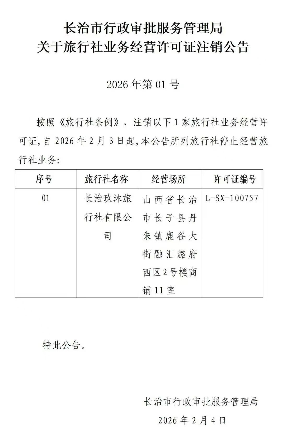 长治市行政审批服务管理局关于旅行社业务经营许可证注销公告