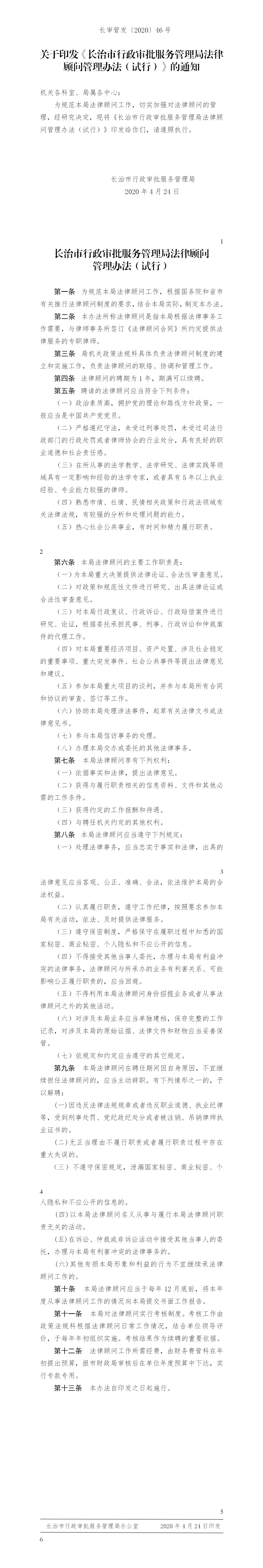 关于印发《长治市行政审批服务管理局法律顾问管理办法(试行)》的通知