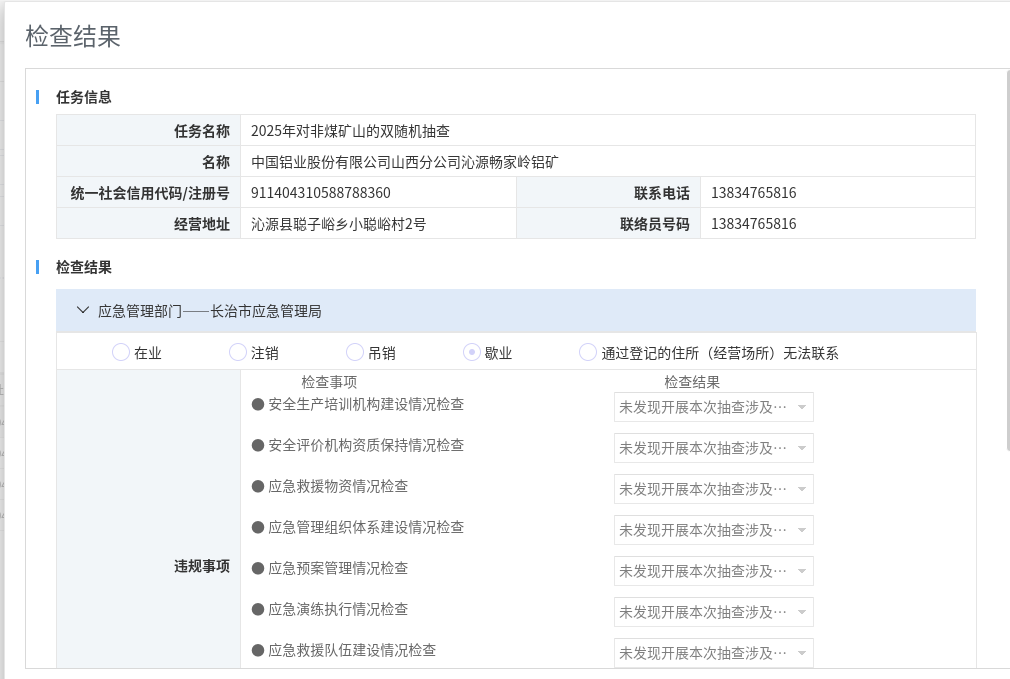 2025年长治市应急管理局“双随机、一公开”抽查检查结果公示(非煤矿山))