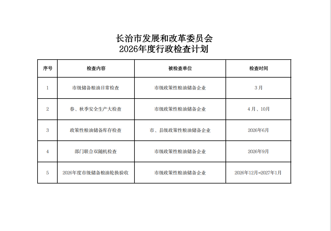 长治市发展和改革委员会2026年度行政检查计划