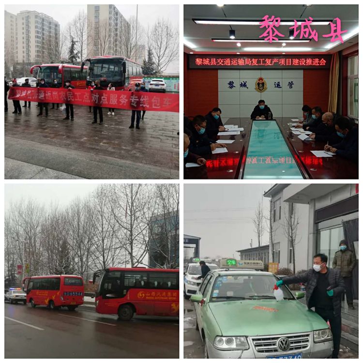 2月23日、25日,黎城县先后召开恢复交通秩序保障道路畅通工作推进会和客运(城市公交)、出租行业恢复运营工作会,提出强化以“人”为核心,搞培训教育;以“站”为源头,落实主体责任;以“车”为根本,严把防控关口;以“物”为保障,及时恢复运营的“四项措施”,总结出了“一戴、二测、三问、四登、五消、六疏、七通”的“七字”操作法,有序分批投用公共交通。同时,建立了“四位一体”工作协调机制,开通了农民工返岗“点对点”直达式定制包车客运服务,运输企业还推出定制客运,实施点到点运输,确保返工返岗人员安全、顺畅、便捷通行。25日开通了县城至黄崖洞镇和县城至平头的两条客运班线,26日开通了县城1路免费公交运行线路、全县70辆出租车按照每天10辆的次序轮流运营,为经济运行和市民生活秩序的正常恢复提供了出行保障。