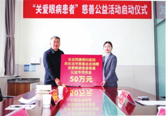 3月21日,由市慈善总会和长治同康眼科医院联合开展的“关爱眼病患者”慈善公益活动举行启动仪式。活动启动后,凡是符合条件的我市贫困白内障患者均可享受不同程度的诊疗补助。当天的启动仪式上,同康眼科医院向市慈善总会捐赠关爱眼病患者慈善公益专项资金50万元。