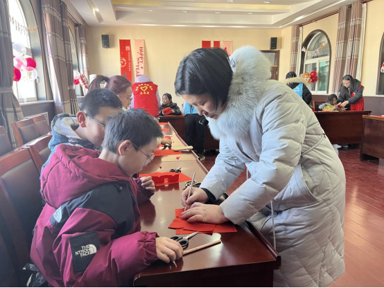 社工带领孩子们做花灯,并邀请传统手艺人郭老师与韩老师教孩子们剪纸、蒸花馍,寻找传统年味,体验非遗文化。