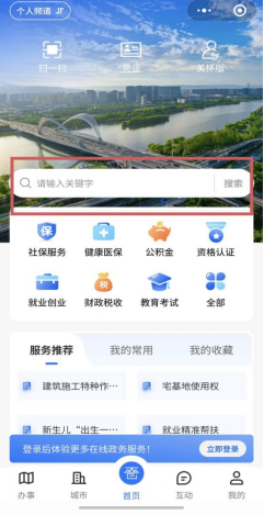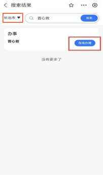 2.登录成功后进入“首页”,在搜索栏搜索“晋心救”,左上角行政区划选定“长治市”,点击在线办理,进入“山西低收入”个人界面。