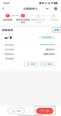 4.根据个人情况完成在线填表,点击下一步,点击新增填写共同生活家庭成员信息,填写完成一位后再次点击新增,直至共同生活家庭成员信息全部完善。填写过程中内容有误可点击“编辑”进行修改。