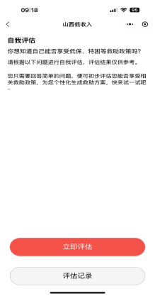 用户可以进入救助自我评估模块,点击立即评估,输入个人基本信息,通过平台智能化的初步评估工具,初步判断自己可能符合哪些救助政策、为您生成个性化救助方案。该功能可以帮助困难群众提前了解政策的适配性,一定程度上避免盲目申请,为后续正式申请社会救助提供清晰指引,节省时间精力。