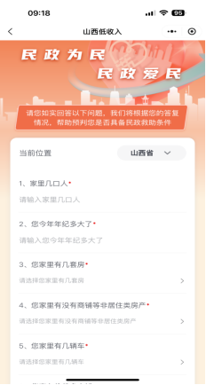 3.在“山西低收入”个人界面进入“申请社会救助—去申请”,进入“民政救助(低保、低边、特困)”,阅读用户须知后点击下一步,选择办理方式后,进入填表界面。