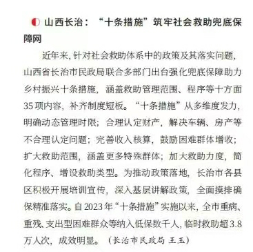 近年来,针对社会救助体系中的政策及其落实问题,市民政局联合多部门出台强化兜底保障助力乡村振兴十条措施,涵盖救助管理范围管理、程序等十方面35项内容,补齐制度短板。“十条推施”从多维度发力,明确动态管理时限;合理认定财产,解决车辆、房产等不合理认定问题,完善收入核算,鼓励困难群体增收,扩大教助范围,涵盖更多特殊群俗;加大救助力度,简化程序、增设救助类型。为推村政策落地,长治市各县区积极开展培训宣传,深入基层讲解政策,全面摸排确保精准落实。自2023年“十条措施”实施以来,全市重病、重残、支出型困难群众等纳入低保数千人,临时救助超3.8万人次,成效明显。