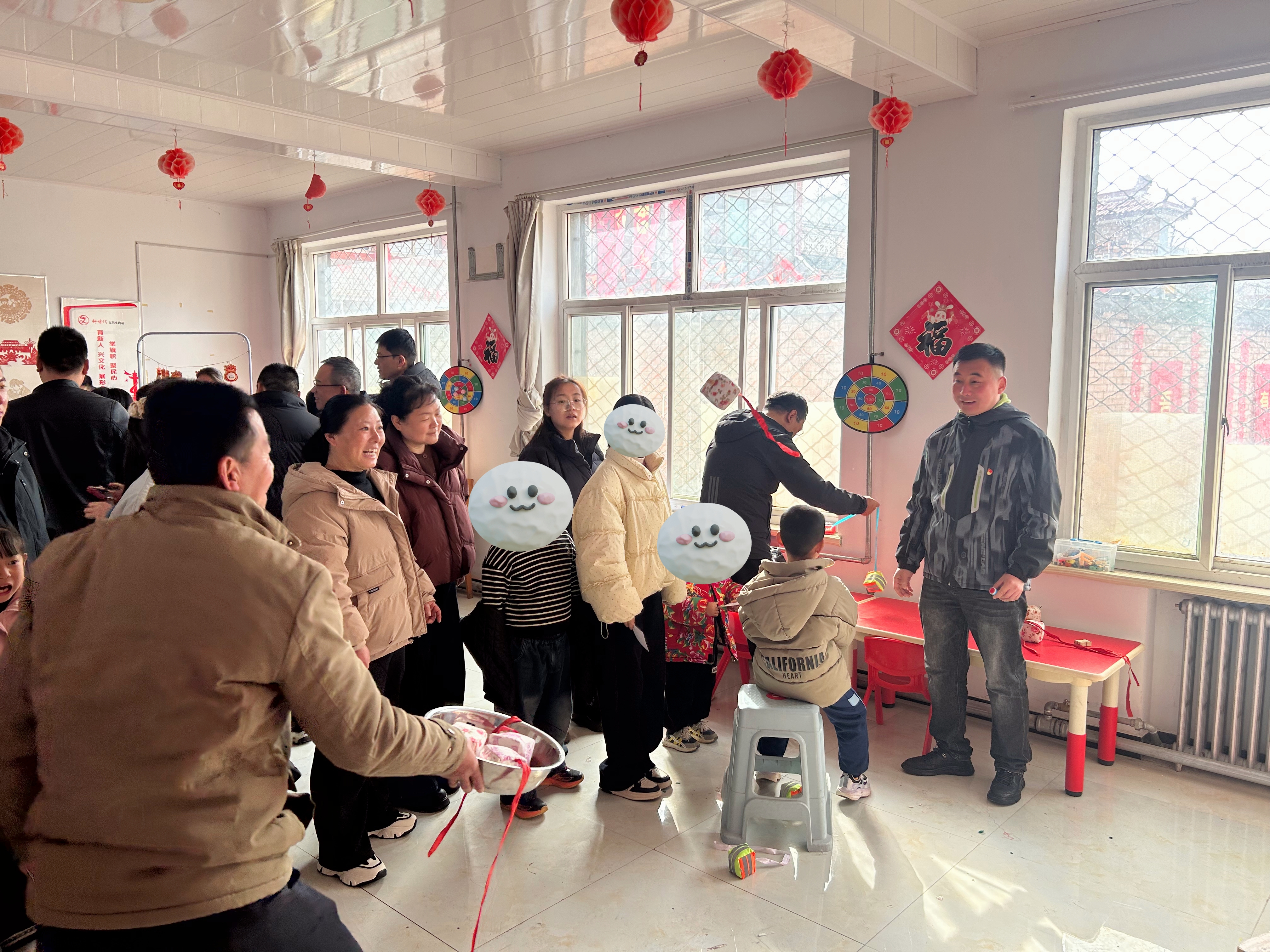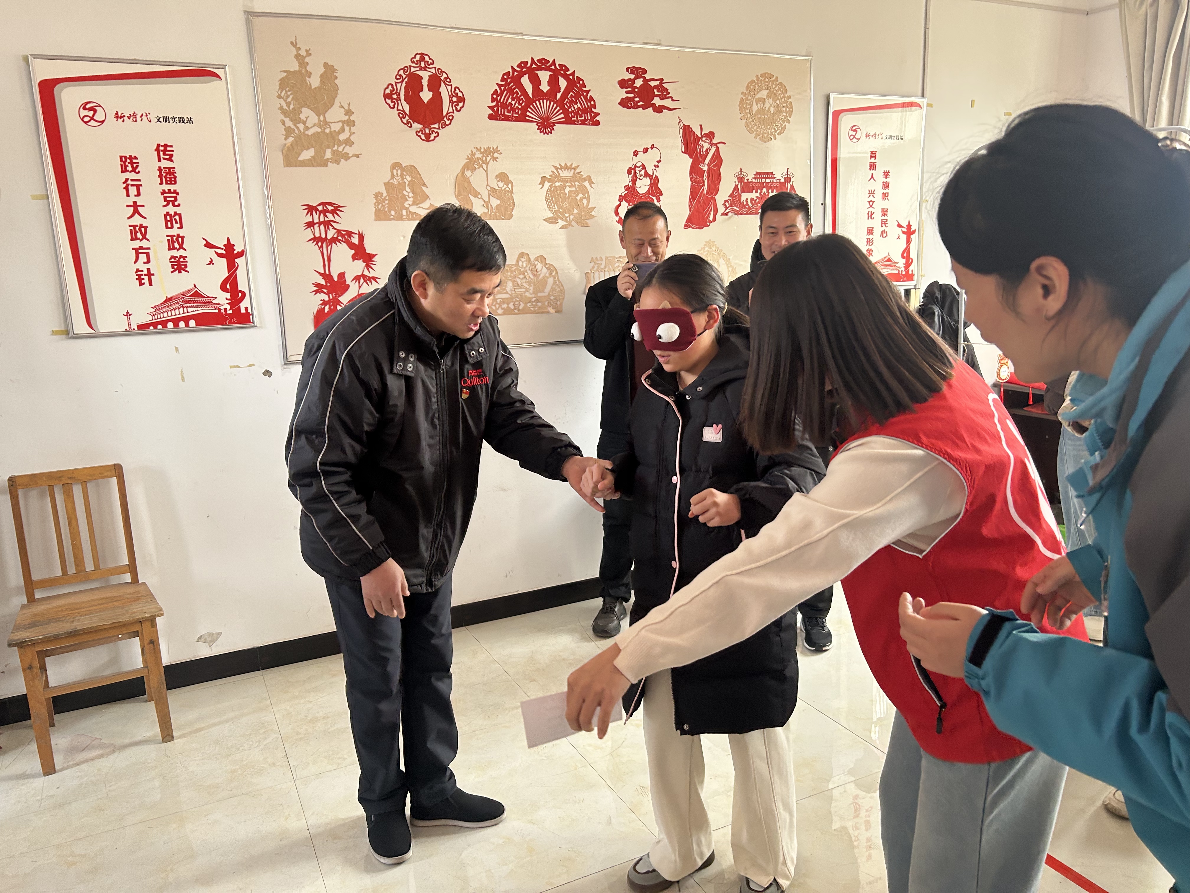 接下来,是亲子闯关游园会。在“灯谜猜猜乐”摊位前,党员志愿者们耐心地为孩子们解读谜面,鼓励他们开动脑筋,共同感受传统文化的魅力。最考验亲子协作的当属“‘元宵’落玉盘”和“蒙眼敲好运”,党员志愿者们时刻关注着每组家庭的动向,不仅细致讲解规则,更在孩子们蒙眼前行、投掷沙包时,站在一旁悉心守护,确保每一位参与者的安全。他们红色的身影在活动现场穿梭,成为一道温暖而坚实的屏障,有效保障了各项游戏安全、有序地进行。